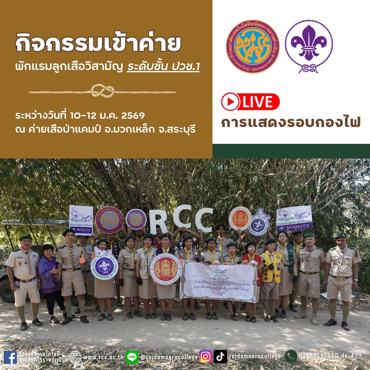 ประกาศเพื่อทราบ ด้วยแผนการเรียนวิทยาลัยเทคโนโลยีพณิชยการราชดำเนิน ตามหลักสูตรได้กำหนดให้นักเรียนระดับประกาศนียบัตรวิชาชีพ(ปวช.) ปีที่ 1 เรียนวิชากิจกรรมลูกเสือวิสามัญ 1-2 โดยมีการจัดการเรียนการสอนทั้งภาคทฤษฎีและภาคปฏิบัติ เพื่อให้ผู้เรียนได้รับความรู้ ทักษะและประสบการณ์ จึงได้จัดกิจกรรมเข้าค่ายพักแรมลูกเสือวิสามัญ และศึกษาดูงานสถานประกอบการด้านวิชาชีพ ระหว่างวันที่ 18-20 กุมภาพันธ์ฺ 2566 ณ ค่ายเสือป่าแคมป์ อำเภอมวกเหล็ก จังหวัดสระบุรี |