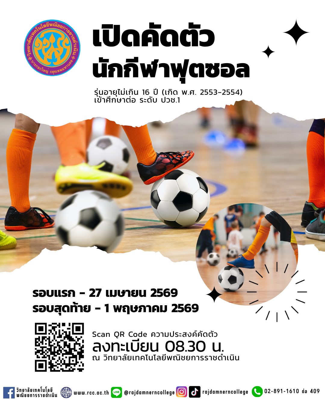 พร้อมปั้นนักฟุตซอลรุ่นใหม่ ที่มีใจรัก! ใครที่มีไฟ มีฝัน และอยากพัฒนาฝีเท้าให้ก้าวไกล โอกาสของคุณมาถึงแล้ว! เตรียมเปิดคัด “ทุนฟุตซอล” รอบแรก : วันจันทร์ที่ 27 เมษายน 2569 รอบสุดท้าย : วันศุกร์ที่ 1 พฤษภาคม 2569 สถานที่ : วิทยาลัยเทคโนโลยีพณิชยการราชดำเนิน ลงทะเบียนหน้างาน : 08.00 น. มาเป็นส่วนหนึ่งของครอบครัว “ราชดำเนิน” ฝึกจริง แข่งจริง พัฒนาเต็มศักยภาพ ต่อยอดทั้งด้านกีฬาและการศึกษาในอนาคต ใครพร้อม…อย่ารอช้า! สอบถามรายละเอียดเพิ่มเติมเกี่ยวกับการคัดตัวนักฟุตซอลที่ อ.คำรณ มุสิจะ (โค้ชฮอลล์) 061-169-9877 หัวหน้าผู้ฝึกสอน : C-License อ.ชาญวิทย์ สร้อยคำ (โค้ชไก่) 081-376-0699 ผู้ช่วยผู้ฝึกสอน : Introductory อ.มุฮัมมัด ครุธเนตร (โค้ชบัง) 090-667-8302 ผู้ช่วยผู้ฝึกสอน : C-License นายธนกฤต ลมูลภักตร์ (โค้ชยีสต์) 087-379-7985 ผู้ช่วยผู้ฝึกสอน : 'G' Diploma